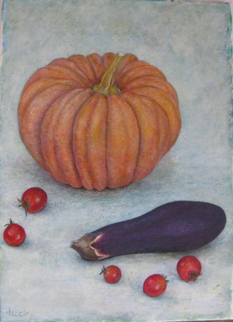 艶のある茄子、ミニトマト、まぶしい夏の光を反射して、鮮やかな画面に。