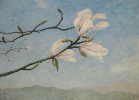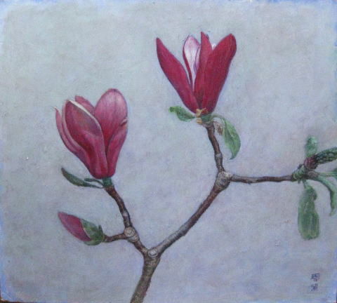 紫モクレンの花は、春先の眠気を和らげる濃ゆい色。花を見上げ、深い息吹をします。