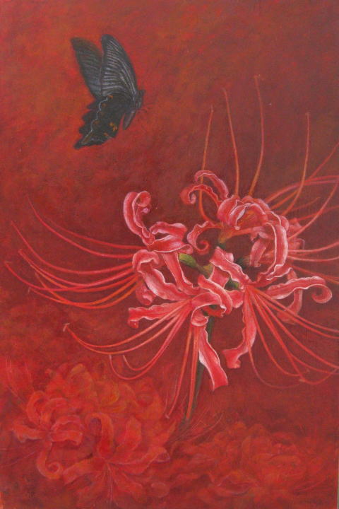 黒い揚羽蝶が花びらに合わせて舞い踊ります。