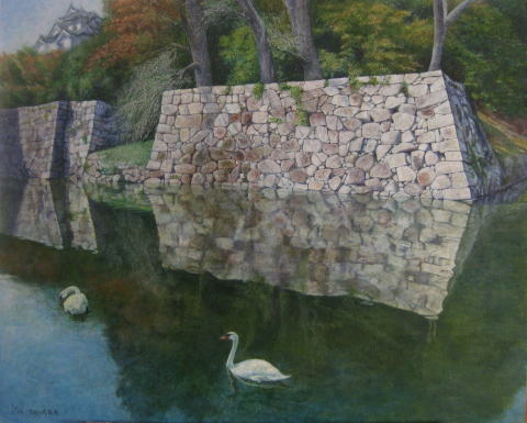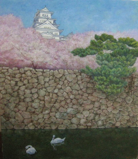 歴史を感じる石垣、淀んだ堀の緑に白鳥と、満開の桜の中に白く輝く城郭の風景です。