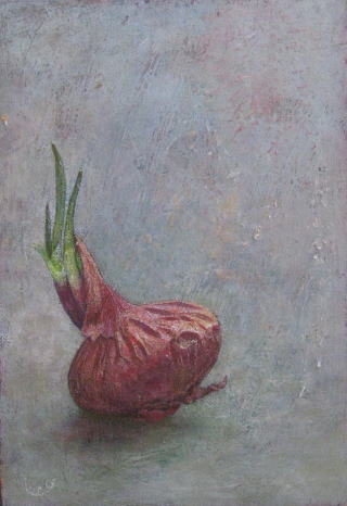 赤玉ねぎの身を包む表皮、赤く染まった芽の一部