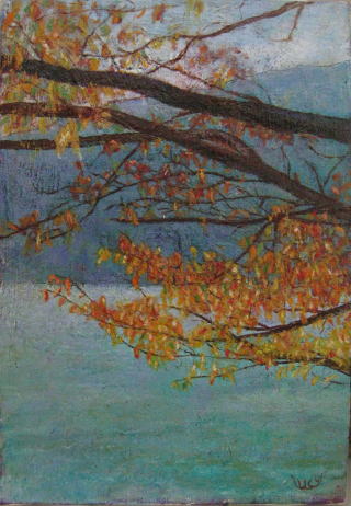 一瞬の晴れ間が湖面にきらめき、落ち着いた色の木々が水面に映し出され